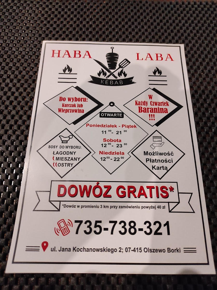 Welcome to HABA LABA KEBAB, your newfound haven for delectable kebabs nestled in Olszewo-Borki, Poland. Located at Jana Kochanowskiego 2, this eatery stands out for its commitment to quality and flavor.